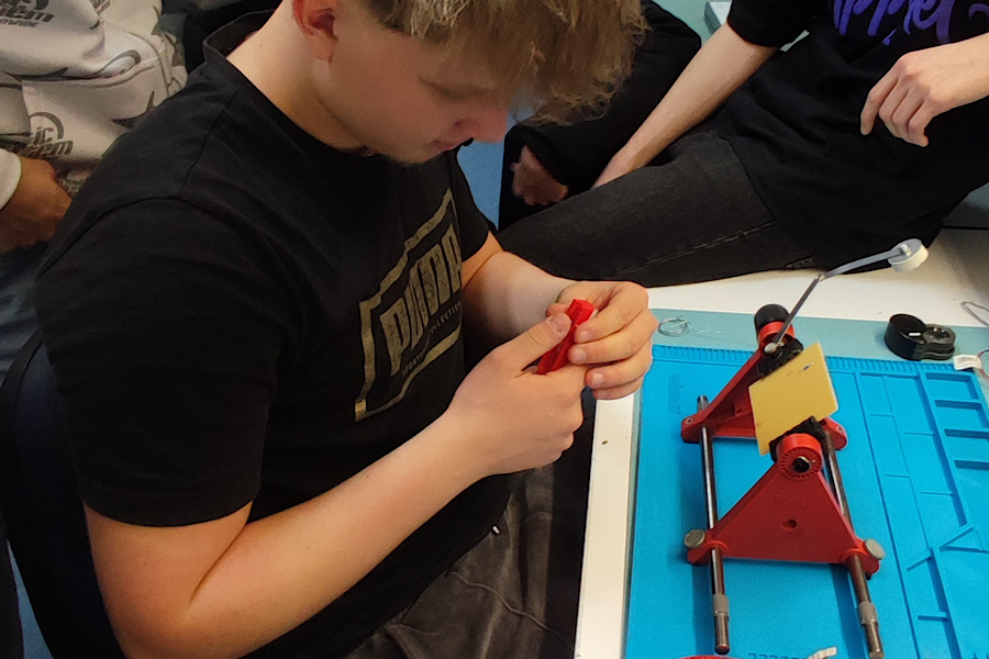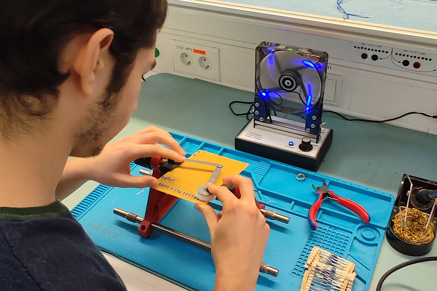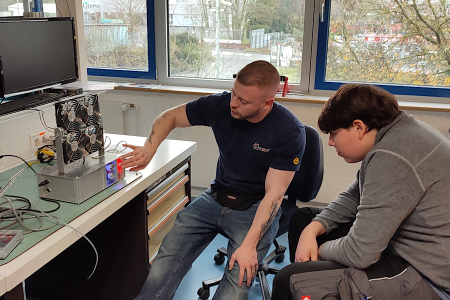 Mit Erdungsfersenbänder versehen ging es anschließend in die Produktion, um Wellenlötanlagen, automatische optische Inspektion und auch Handlöten kennenzulernen. In der Lehrwerkstatt durften die Schüler selbst versuchen, Widerstände auf Platinen zu löten und konnten im Gespräch mit Auszubildenen mehr über den Beruf Industrieelektriker, Fachrichtung Geräte und Systeme, erfahren. Vielen Dank an die Firma Limtronik für den spannenden Einblick in dieses Berufsfeld!