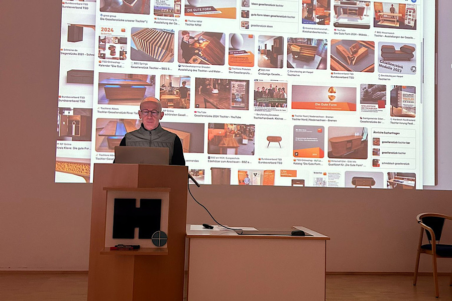 Im Fokus standen der Entwicklungsprozess von Gesellenstücken sowie die konstruktiven Unterstützungsmöglichkeiten von Lehrkräften für die zukünftigen Tischlerinnen und Tischler. Auch die Schulung des sogenannten „kritischen Auges“ war Gegenstand der Veranstaltung.