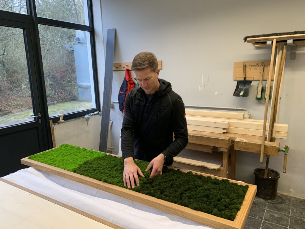 Nach der Fertigstellung der Rahmen, welche geölt wurden, übernahm die Berufsfachschulklasse die kreative Gestaltung. Hierbei wurde präpariertes Moos in verschiedenen Grüntönen eingesetzt, um eine natürliche und zugleich langlebige Optik zu gewährleisten. Die Schülerinnen und Schüler arrangierten das Moos sorgfältig in die Rahmen und sorgten durch gezielte Platzierung für eine harmonische Optik.