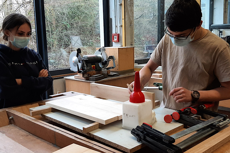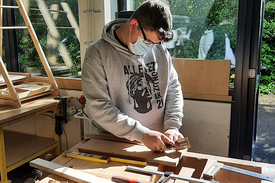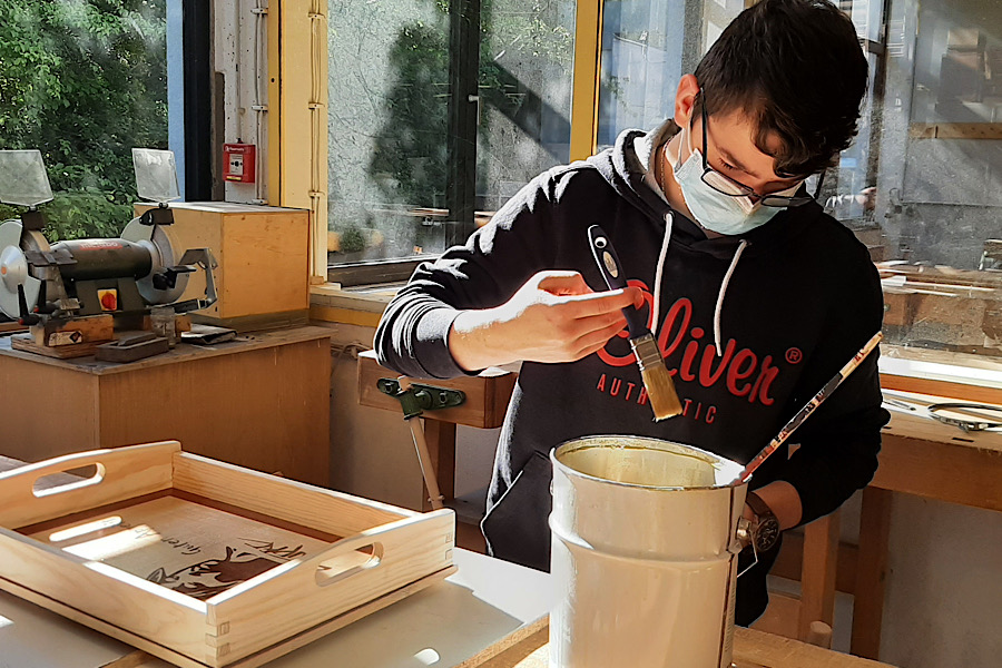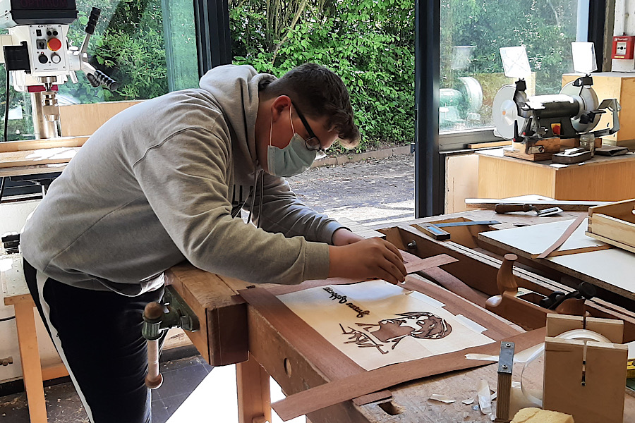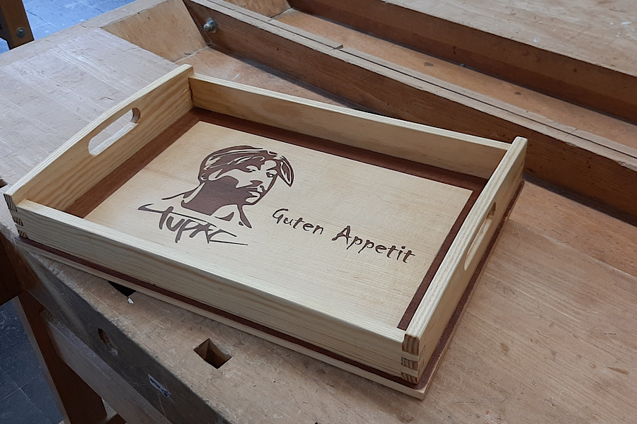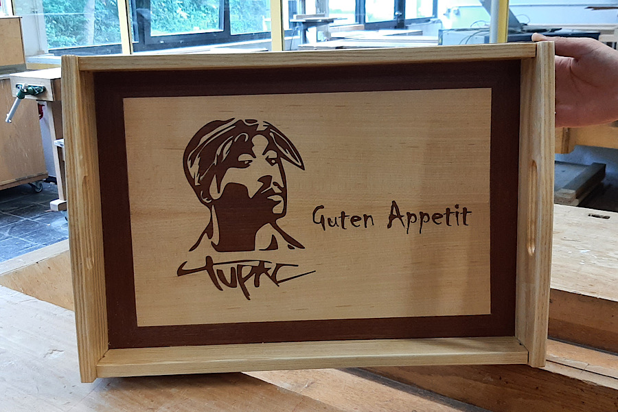 Die Schülerinnen und Schüler der Klasse Pb9b der Theodor-Heuss-Schule stellten mit ihrem Fachlehrer Kay Simon Serviertabletts her. Die Tabletts entstanden im Rahmen des fachpraktischen Unterrichts in der Vertiefungsphase der beruflichen Orientierung im Fachbereich Holztechnik. Der Rahmen sowie der Boden des Tabletts bestehen aus Massivholz. Neben der Herstellung des Tabletts wurden im Theorieunterricht die Themen Breitenverleimung von Massivholz, Eigenschaften des Holzes, Handwerkzeuge und verschiedene Holzverbindungen bearbeitet. Der Boden des Tabletts wurde mit einer Marketerie versehen. Bei einer Marketerie wird ein Motiv aus verschiedenen Furnierstücken zusammengesetzt und auf ein Trägermaterial aufgeleimt. Die Schüler einigten sich bei dem Motiv auf die Silhouette des Rappers „Tupac“, welche auch auf ihren Abschlussshirts zu sehen ist. Das Motiv und ein individueller Schriftzug für jede Schülerin und jeden Schüler wurde mit dem schuleigenen Lasergerät ausgelasert und schließlich auf den Massivholzboden aufgeleimt. Mit großem Stolz über ihre handgefertigten Tabletts servieren sie jetzt darauf leckere Köstlichkeiten für ihre Familien.