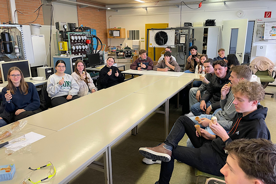 Das Highlight des Tages bildete jedoch das praktische Erlebnis, als die Schülerinnen und Schüler die Gelegenheit erhielten, ihr eigenes Eis aus „Flüssiger Lust“ herzustellen. Dieser kreative Ansatz ermöglichte nicht nur einen unterhaltsamen Ausklang, sondern veranschaulichte auch die vielfältigen Anwendungsmöglichkeiten von Technologien im täglichen Leben.