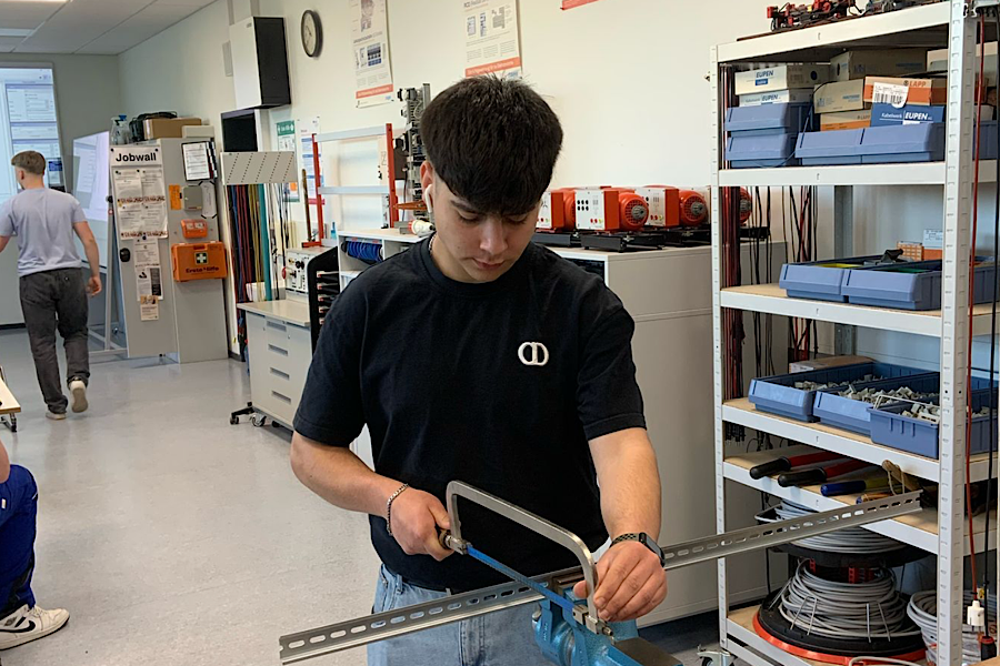 Im Rahmen eines schulformübergreifenden Projekts haben Schülerinnen und Schüler der Berufsfachschule Elektrotechnik (BFS), des Beruflichen Gymnasiums (BG) sowie Auszubildende im zweiten Ausbildungsjahr zum Elektroniker für Betriebstechnik erfolgreich gemeinsam an der Entwicklung eines Lernträgers für die Steuerungstechnik gearbeitet.