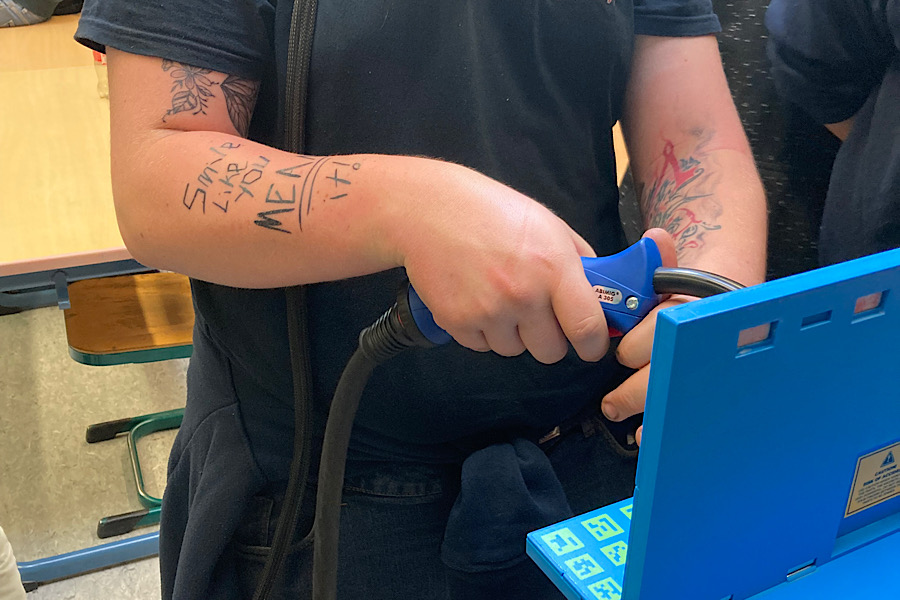 Die angehenden Kraftfahrzeug-, Nutzfahrzeug-, Bau- und Landmaschinenmechatroniker und -mechatronikerinnen des 1. Ausbildungsjahres konnten an den Schweißsimulatoren der Friedrich-Dessauer-Schule die Schweißverfahren MIG/MAG, WIG und Lichtbogenhandschweißen gefahrlos ausprobieren und auswerten lassen. Mit AR-Brille und optional im Sichtfeld einblendbaren Hilfen zu Abstand, Brennerhaltung und -geschwindigkeit wurden sich Wettbewerbe um die höchste Bewertung der Schweißung geliefert.